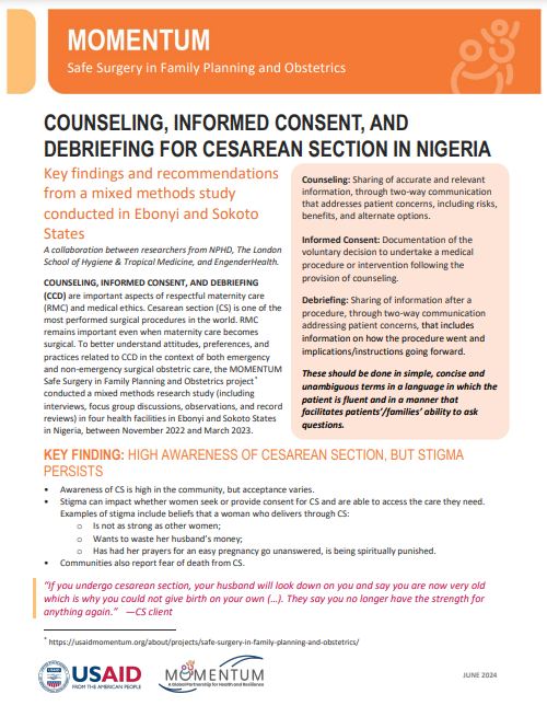 COUNSELING, INFORMED CONSENT, AND DEBRIEFING (CCD) are important aspects of respectful maternity care (RMC) and medical ethics. Cesarean section (CS) is one of the most performed surgical procedures in the world. RMC remains important even when maternity care becomes surgical. To better understand attitudes, preferences, and practices related to CCD in the context of both emergency and non-emergency surgical obstetric care, the MOMENTUM Safe Surgery in Family Planning and Obstetrics project * conducted a mixed methods research study (including interviews, focus group discussions, observations, and record reviews) in four health facilities in Ebonyi and Sokoto States in Nigeria, between November 2022 and March 2023.